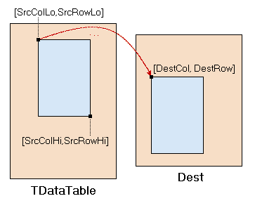 The method CopyToArray copies the cells of the data table in the range from [SrcColLo,SrcRowLo] to [SrcColHi,SrcRowHi] to the position [DestCol, DestRow] of the dynamic array Dest. If any of the cells to be copied fall outside of the destination range these cells are ignored. Please note that the version [2] rounds the values before copying them.