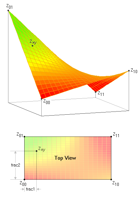 The function InterpolZofXYRect interpolates the z coordinate Zxy at a particular position of a simple 3D surface (assuming that the surface is a plane or a saddle). The surface is spanned by four points which are located at the corners of a rectangle. The z values at the corners are specified by the parameters z00, z01, z10, and z11. The position of the unknown z value is defined by the fractions along the x- and the y-axis (parameters frac1 and frac2). The function returns the estimated z value Zxy at the specified position.