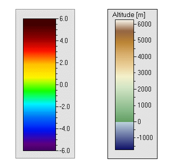 The class TColorScale is a component which displays color encoded scales as commonly used, for example, in geographic maps. At the left you see two examples of color encoded scales, one using the standard spectrum assignment, the other using a special user-defined assignment.