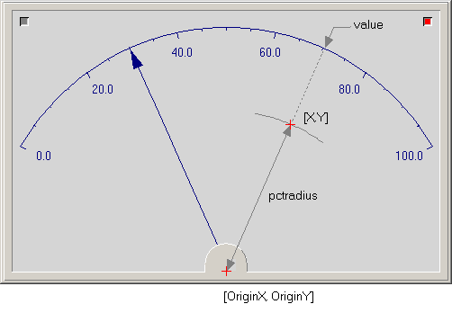 The method ConvertToPixelCoords transforms the value of the meter (parameter value) and a percentage of the scale radius (parameter pctradius) into the pixel coordinates X and Y. This method can be used to draw user-defined graphics or text on the TMeter canvas (the canvas can be accessed using the events OnMeterRendered, OnBeforeDrawNeedle, or OnBeforeDrawScaleLabel).