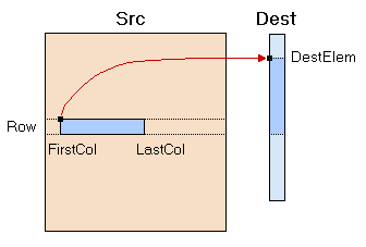 The function Copy2DRowTo1DArray copies the contents of the row Row of the two-dimensional source array Src to the one-dimensional destination array Dest. All columns of the row Row from given indices FirstCol to LastCol will be copied to cell DestElem and the subsequent ones. Indices are 0-based. Setting both parameters FirstCol and LastCol to zero values defaults to the entire row.