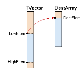 The method CopyToArray comes in two different overlaid versions. Versions [1] and [2] copy the cells of the vector in the range from [LowElem] to [HighElem] to the dynamic array DestArray, starting with the cell DestElem. The size of the destination array is automatically adjusted to the size of the specified range plus DestElem.