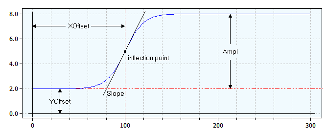The function CreateSigmoidArray generates a sigmoid function and fills the array Data with the corresponding values. The parameter Slope determines the slope of the function in the inflection point, the parameter Ampl the amplitude of the function, and the parameters XOffset and YOffset control the offsets in x and y direction. Please note that the XOffset is equivalent to the index of the data array. The following figure shows the generated radius basis function using the following parameters: Slope = 0.10