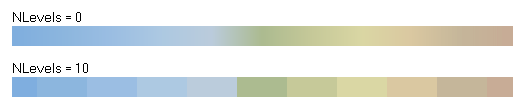 The method FillByInterpolation allows to generate an array of colors. The basic idea is to use n pivot colors which are regularly spaced across the entire array (the first pivot color is always at index 1, the last is always the last color of the array). The colors between the pivot colors are calculated by linear interpolation. The parameter Colors is an open array of any number of pivot colors which are to be used for the calculation of the color array. The parameter DiscreteLevels determines how many color shades are generated. Setting DiscreteLevels to zero generates continuous colors, any positive value results in the corresponding number of shades. This can be used to generate color scales typically used in geographic maps. The following image shows the effect of the parameter DiscreteLevels.