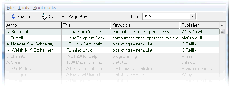 The method FilterAndSort allows setting the enabled/disabled state of all rows according to some filter criterion. In addition, the enabled and the disabled rows may be sorted separately. The following image shows part of a screen shot of a publications database which has been filtered for the keyword "Linux" and sorted by column "Title". The found database entries show up in the first four rows of the report listview, all the other entries are grayed out and listed below the active entries.
