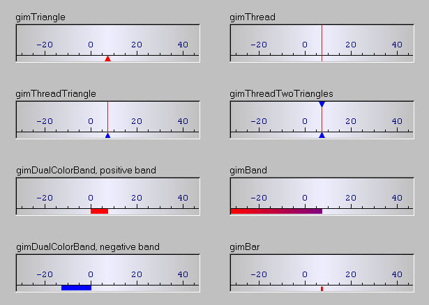 The property IndexMode specifies how the value of the gauge is visualized. The following image shows all seven modes. Please note that in the gimDualColorBand mode, the displayed band changes its color if it crosses the GaugeZero threshold. The colors of the index is controlled by the properties ColorIndex1 and ColorIndex2.