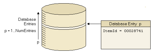 Accessing a particular entry of the database is normally performed by using its database entry number p (see figure below). However, entry numbers may change during the lifetime of a database (i.e. after deleting one or more entries). Consequently, they must not be used to set up relations between database entries. In order to have a reliable, never-changing and unique key to the data in the database, each new entry automatically receives an item ID (parameter ItemID) which can be used to access a particular database entry even when the entry number has changed.