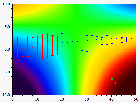 The method MarkErrorBar displays a symbol at the position [x,y] together with an error bar whose lower and upper boundaries are controlled by the parameters dlower and dupper which indicate the length of the respective part of the error bar. The error bars may either be displayed vertically or horizontally (parameter Dir). The following image shows a series of vertical error bars and two horizontal bars (using different symbols and colors):