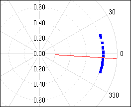 The read-only property MeanAngleX returns the mean of the x-values interpreted as angles measured in degrees. For example, the angles of 5°, 1°, and 357° are quite close to each other and the mean of them would be 1°, and not 121°, as the numerical average suggests. The following diagram shows 20 angles (blue points in polar diagram) randomly distributed around zero degrees. The average angle is 356° and is indicated by the red line.