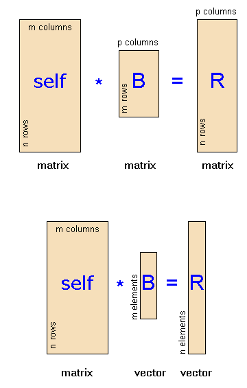 The multiplication of two matrices is only possible if the number of columns of the first matrix (self ) equals the number of rows of the second matrix (MatB ). The resulting matrix MatRes or the resulting vector VecRes are automatically resized to the appropriate dimensions. The following figure illustrates the context:
