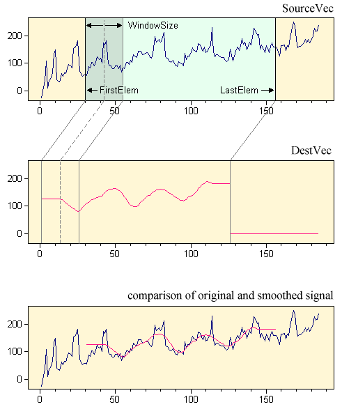 Following is an example for smoothing a data series of 185 points. The elements between 30 and 155 are submitted to the smoothing algorithm using a smoothing window size of 25 elements. Note that the first 12 (=WindowSize div 2), and the last 12 elements of the smoothed series are constant.