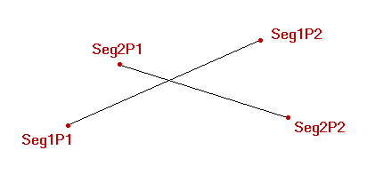 The function SegmentsIntersect tests whether two line segments defined by their respective endpoints Seg1P1, Seg1P2 and Seg2P1, Seg2P2 intersect. The function returns TRUE if the two segments intersect.
