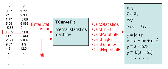 The class TCurveFit provides a simple-to-use means for curve fitting by means of linear regression and splines. In addition, TCurveFit calculates the most important statistical parameters, such as the mean values, the standard deviation, and the correlation coefficient of a series of data pairs. In order to utilize the class TCurveFit, you have to enter the data pairs (x and y) by the method EnterStatValue. The regression parameters can then be obtained by calling the appropriate regression method.