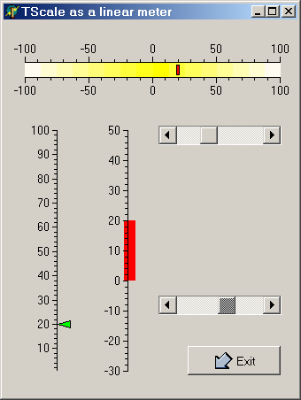 The class TScale is a component for displaying scales in various forms. All usual kinds of scales can be displayed (linear, logarithmic, date and time, horizontal, vertical, etc.) - for more details please have a look at the online help pages.
